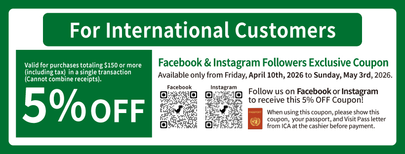 Get a 5% off coupon valid on purchases of SGD 150 or more (including tax)!